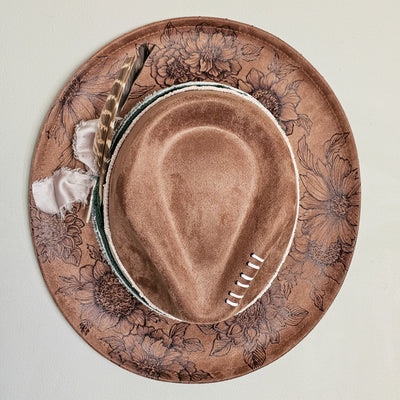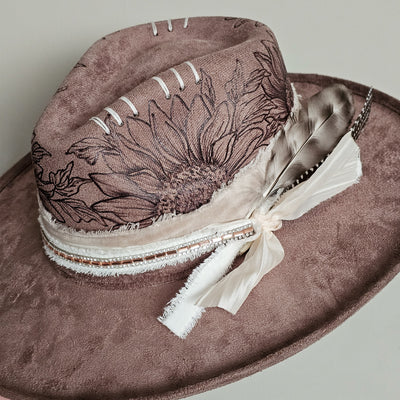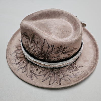 Rustic Sunflower || Tan Suede Burned Wide Brim Hat