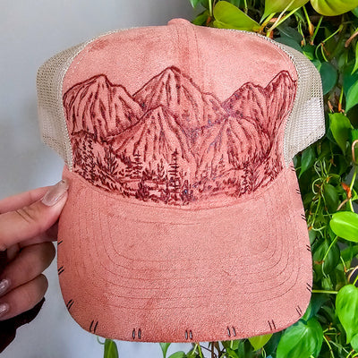 The Mountains are Calling || Coral and Cream Suede Baseball Mesh Trucker Style Hat || Freehand Burned