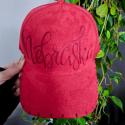 Nebraska || Red Suede Baseball Style Mesh Trucker Hat || Freehand Burned
