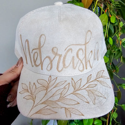 Nebraska || Ivory Suede Baseball Style Mesh Trucker Hat || Freehand Burned