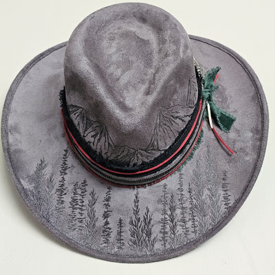 Mountain Views || Gray Suede and Faux Tooled Leather Baseball Style Hat || Freehand Burned