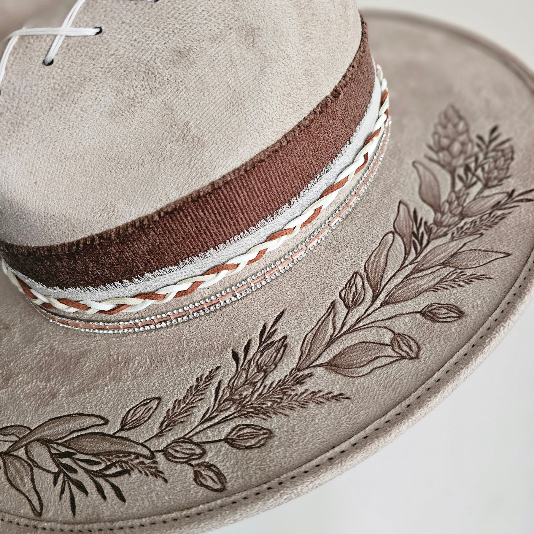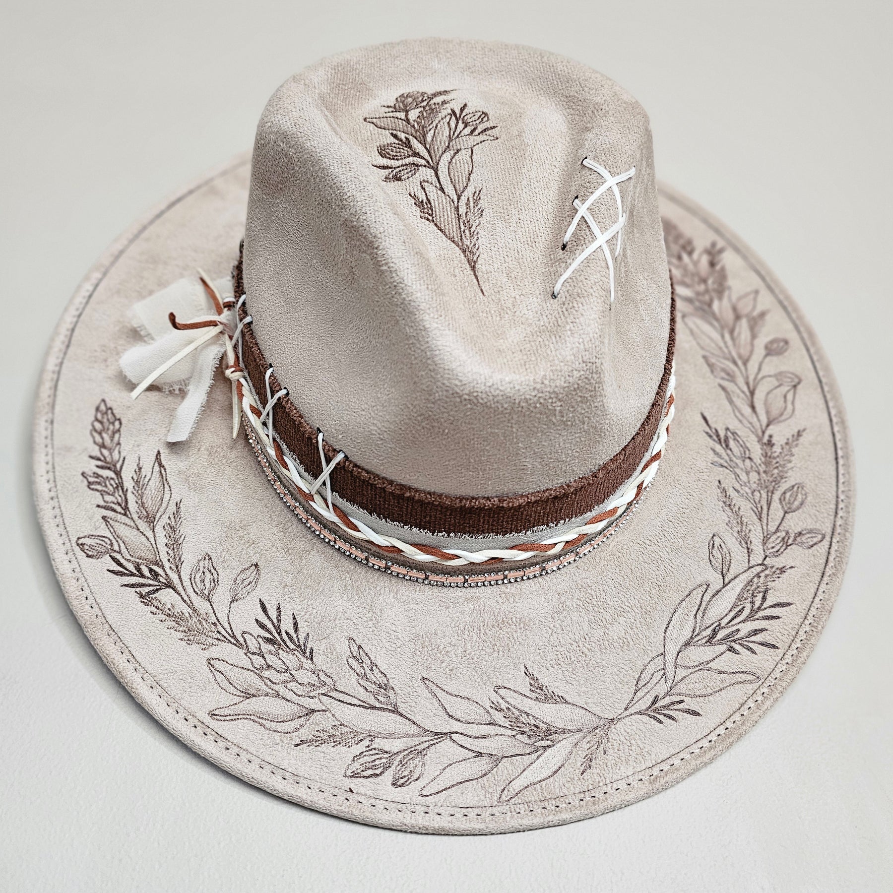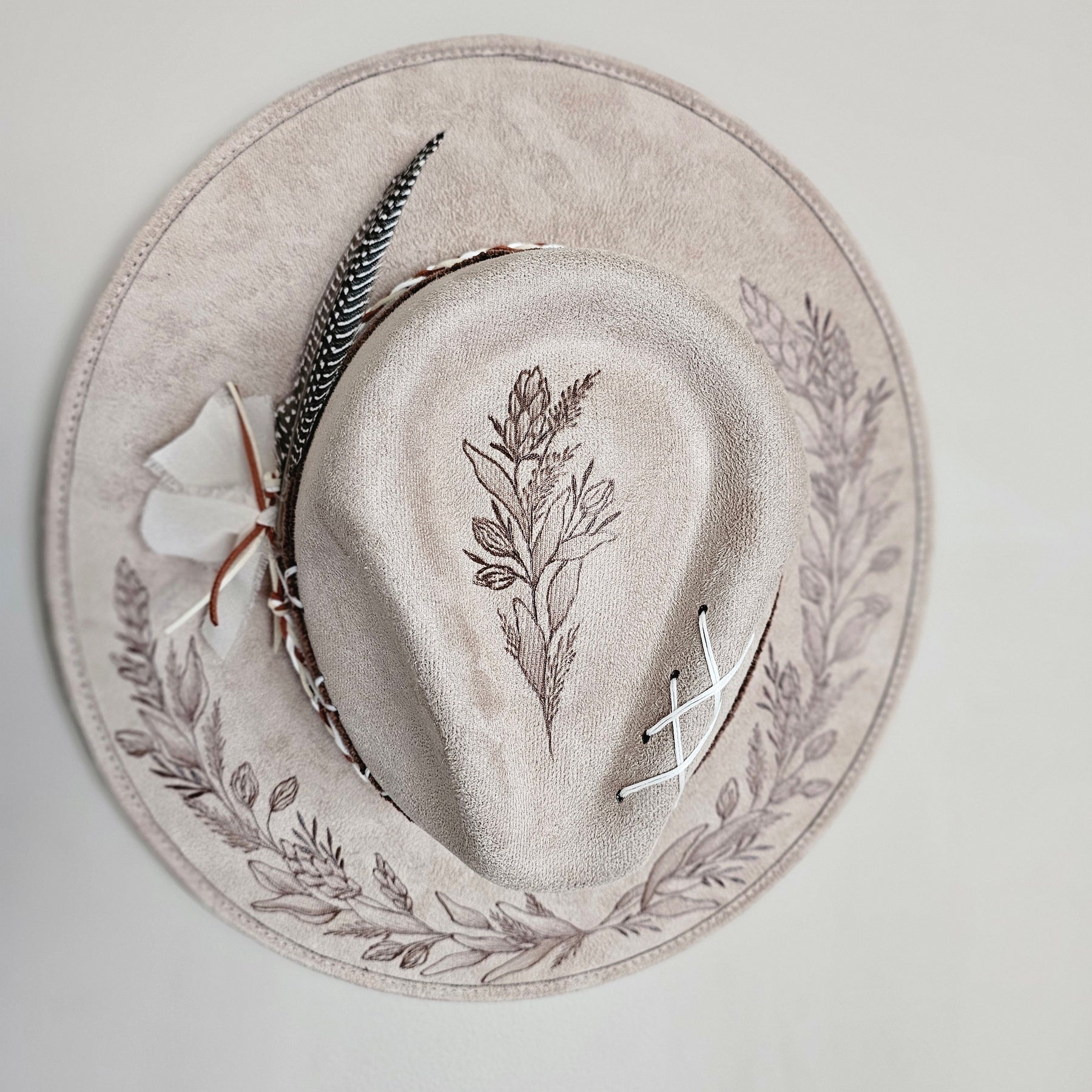 All hats are freehand drawn and burned with a heat tool. Most of my designs include floral and stems. I've always been drawn to flowers since I was a child. My grandma has the most beautiful garden and she was always rattling off the names of each one and showing me their gorgeous blooms.