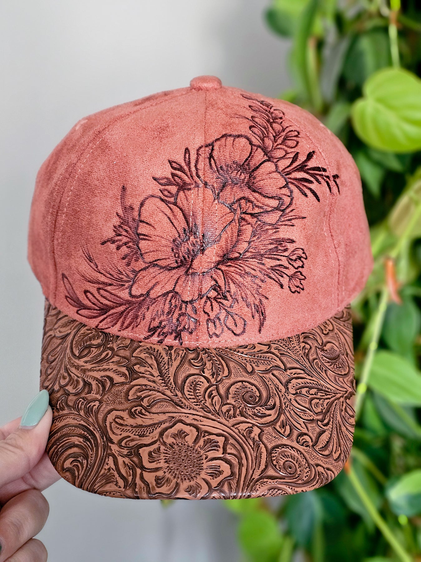 All hats are freehand drawn and burned with a heat tool. Most of my designs include floral and stems. I've always been drawn to flowers since I was a child. My grandma has the most beautiful garden and she was always rattling off the names of each one and showing me their gorgeous blooms.
