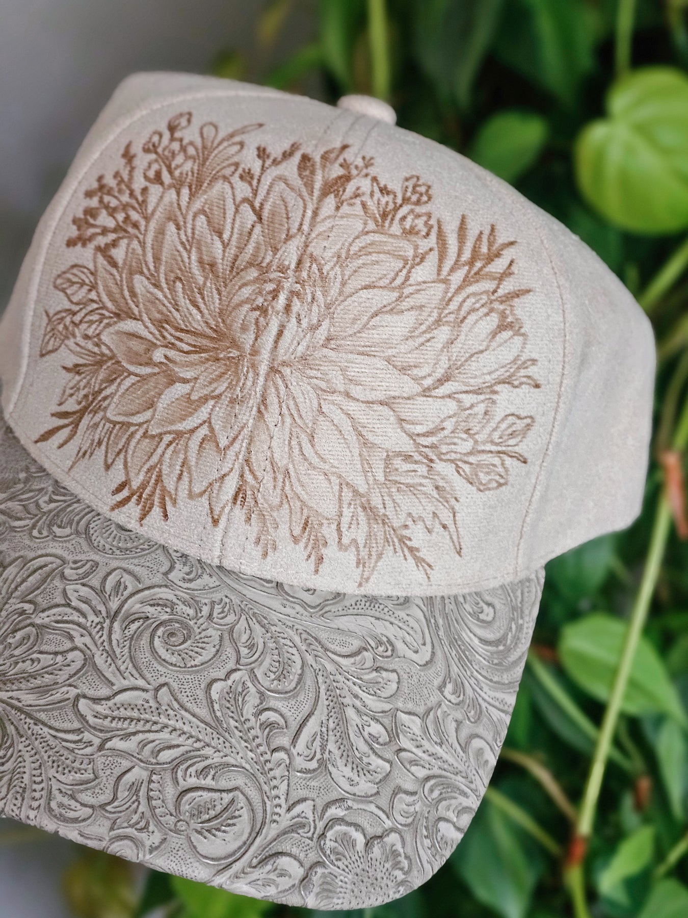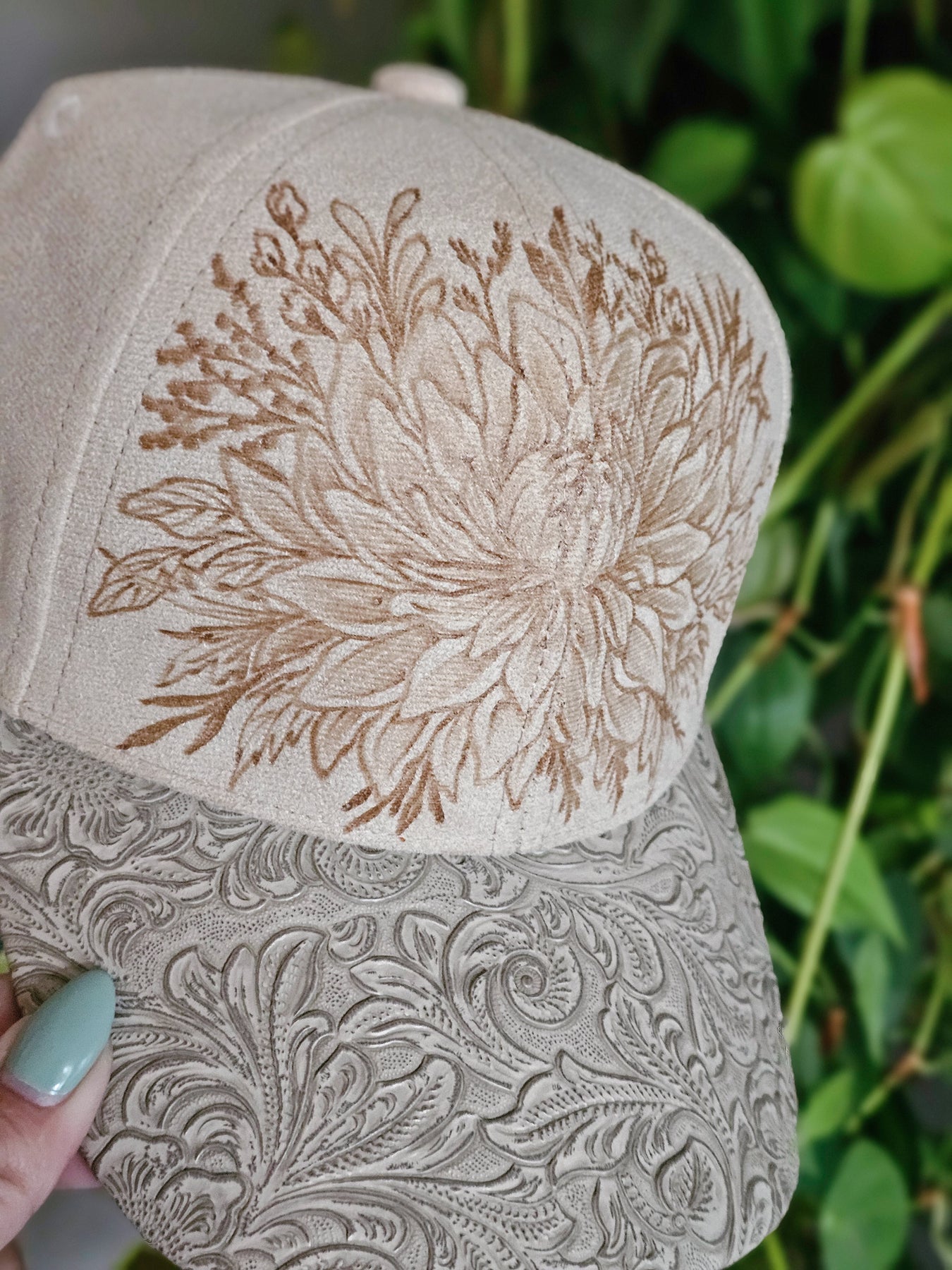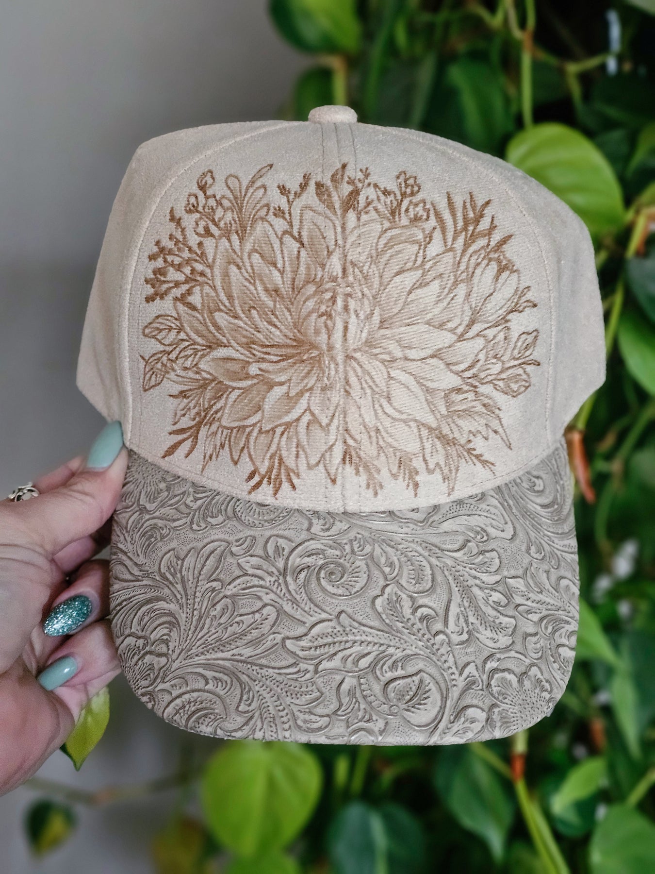 Dahlia ||Cream Suede and Faux Tooled Leather Baseball Style Hat || Freehand Burned