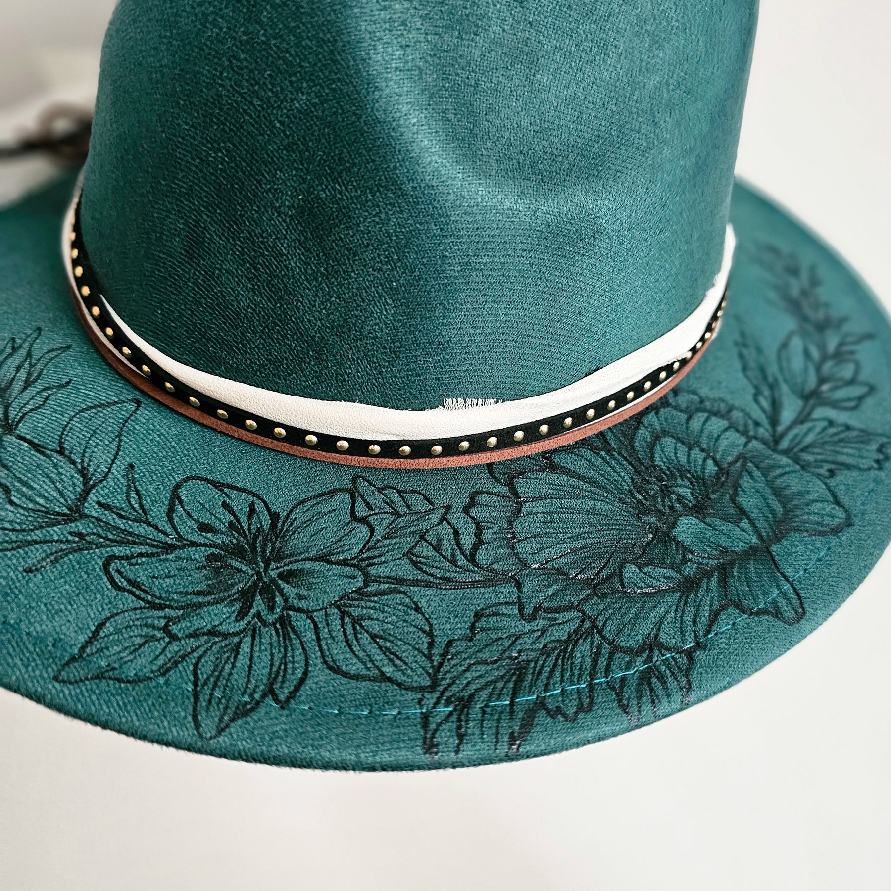 All hats are freehand drawn and burned with a heat tool. Most of my designs include floral and stems. I've always been drawn to flowers since I was a child. My grandma has the most beautiful garden and she was always rattling off the names of each one and showing me their gorgeous blooms. I'm also inspired by the mountains. I was born in Northeast Oregon and admire the beauty of the trees and scenery there. We take at least one trip to the Colorado mountains each Summer, so I take loads of photos and soak in all the views while we are there. I definitely draw my inspiration from nature and try to incorporate it into each design.