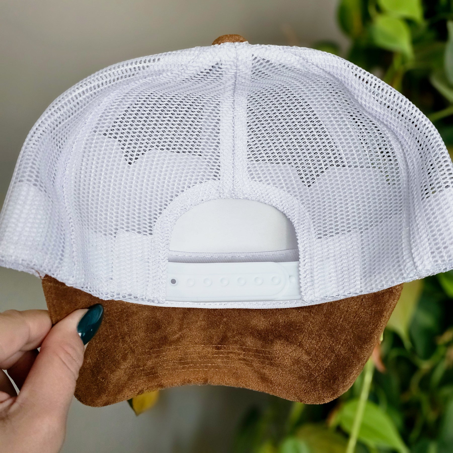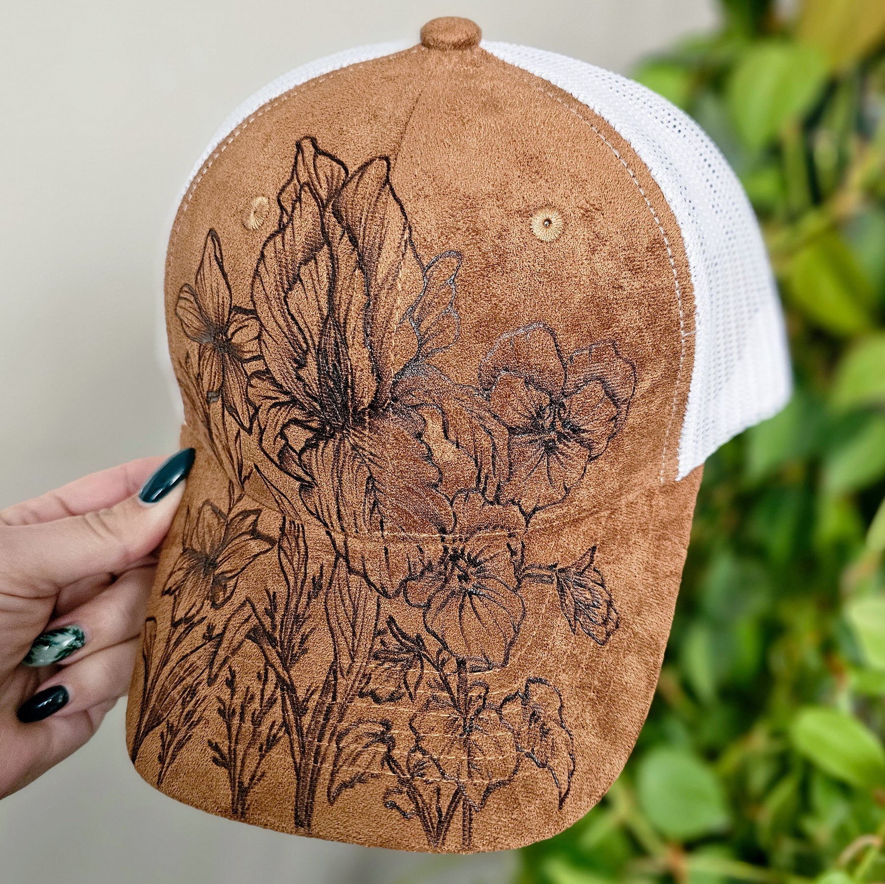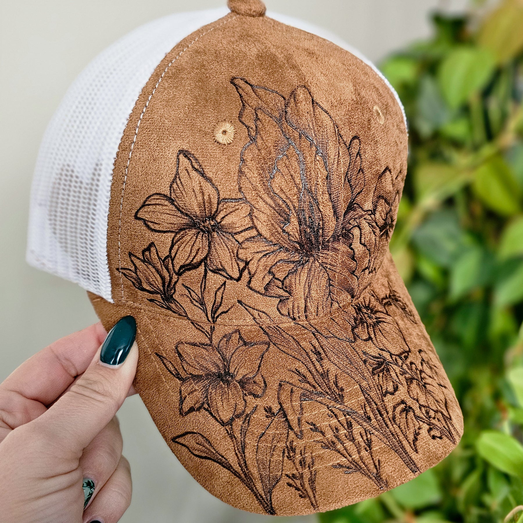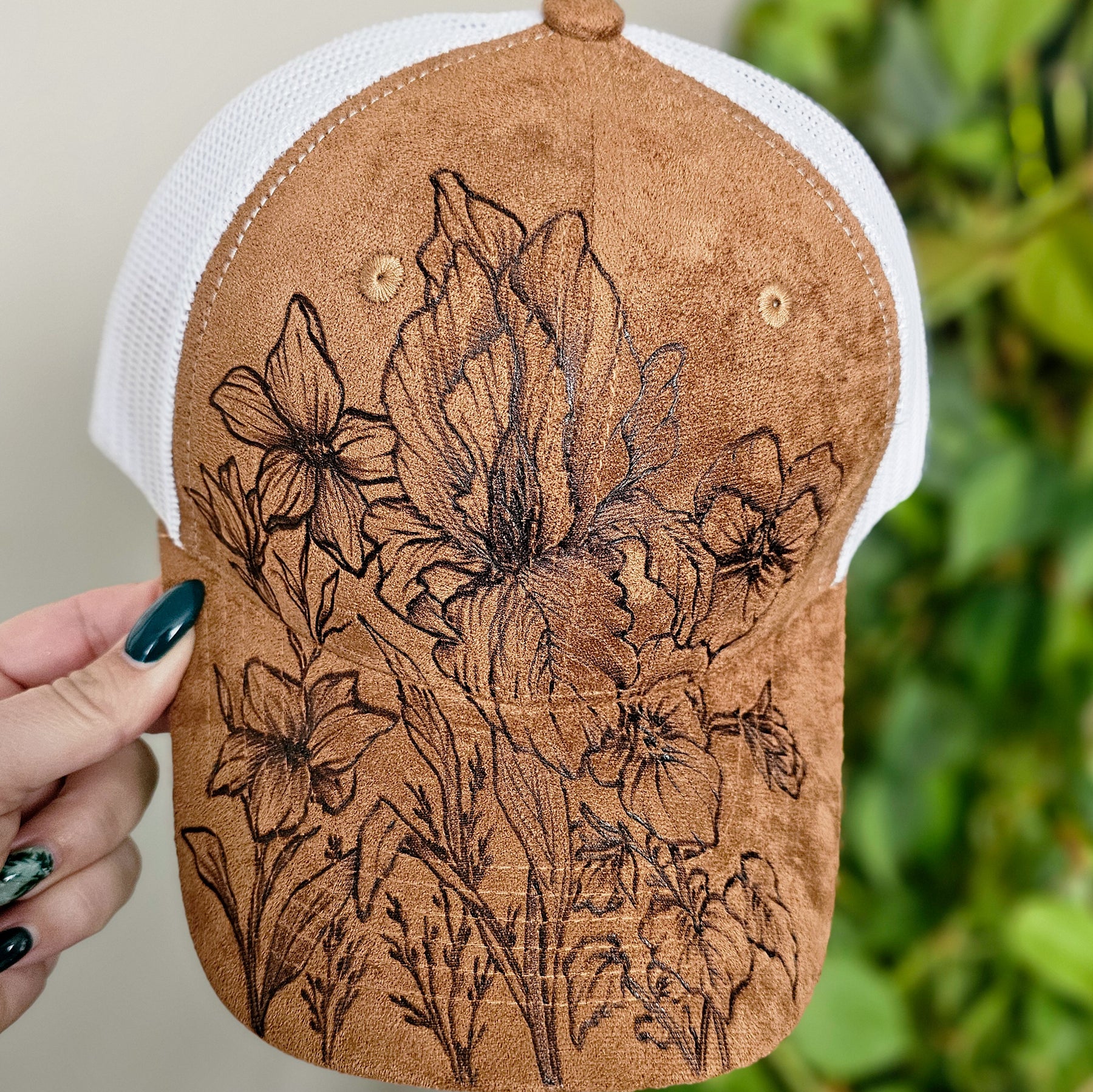 February Birth Flowers || Primrose + Iris + Violets || Camel Suede + White Mesh Trucker Hat || Freehand Burned