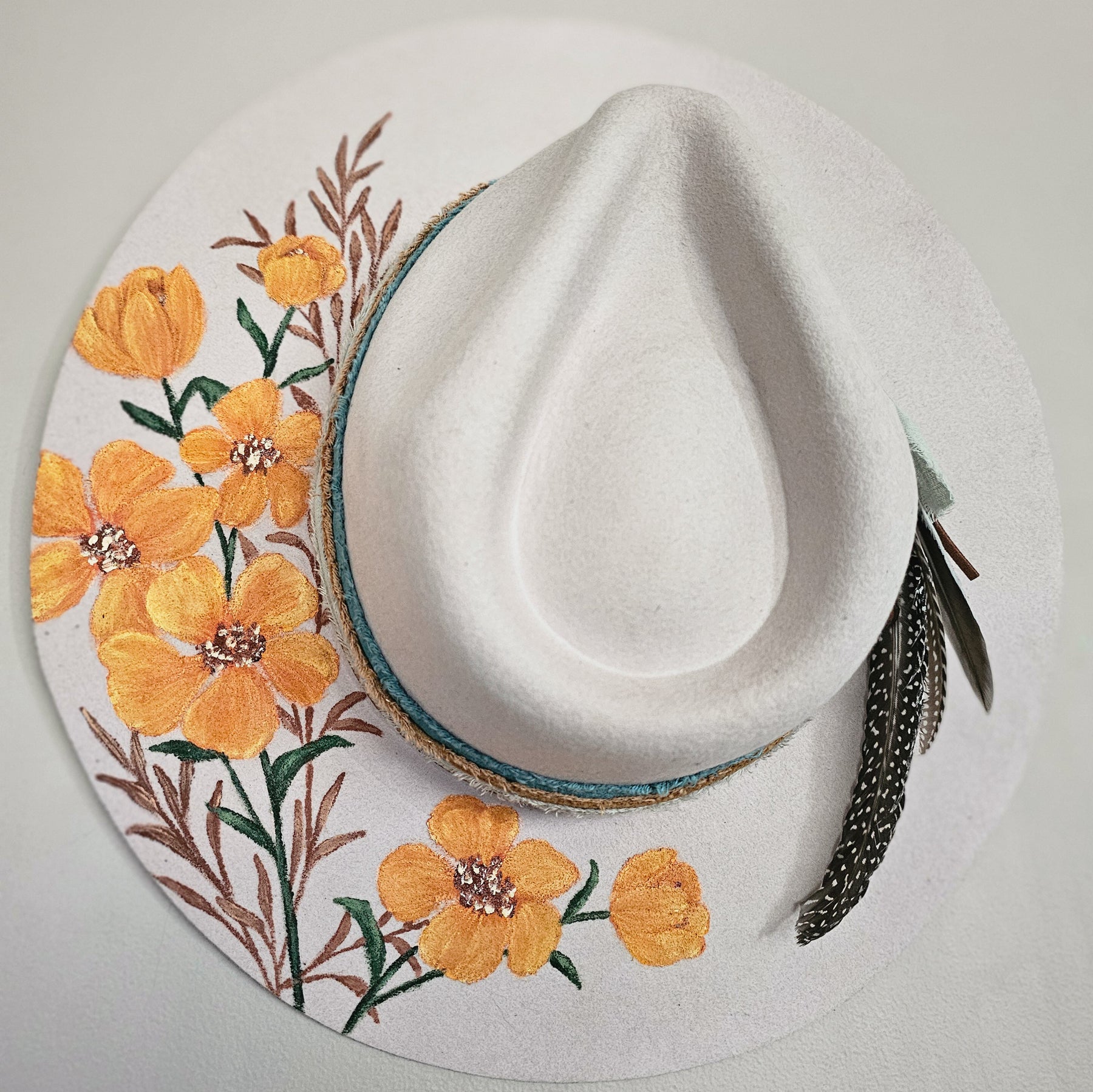 All hats are freehand drawn and burned with a heat tool. Most of my designs include floral and stems. I've always been drawn to flowers since I was a child. My grandma has the most beautiful garden and she was always rattling off the names of each one and showing me their gorgeous blooms. I'm also inspired by the mountains. I was born in Northeast Oregon and admire the beauty of the trees and scenery there. We take at least one trip to the Colorado mountains each Summer, so I take loads of photos and soak in all the views while we are there. I definitely draw my inspiration from nature and try to incorporate it into each design.