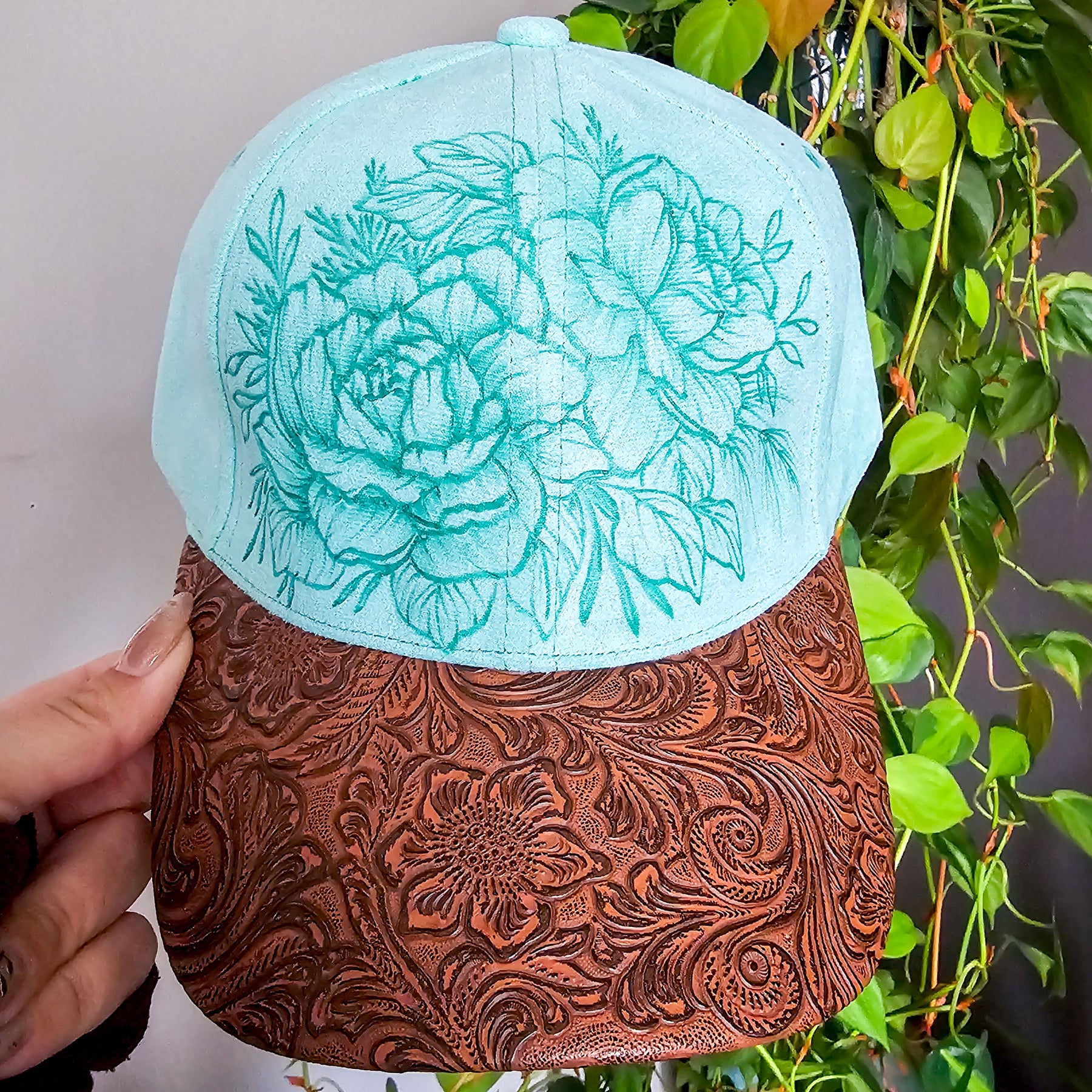 Peonies and Tooled Leather|| Mint Suede Baseball Style Hat || Freehand Burned