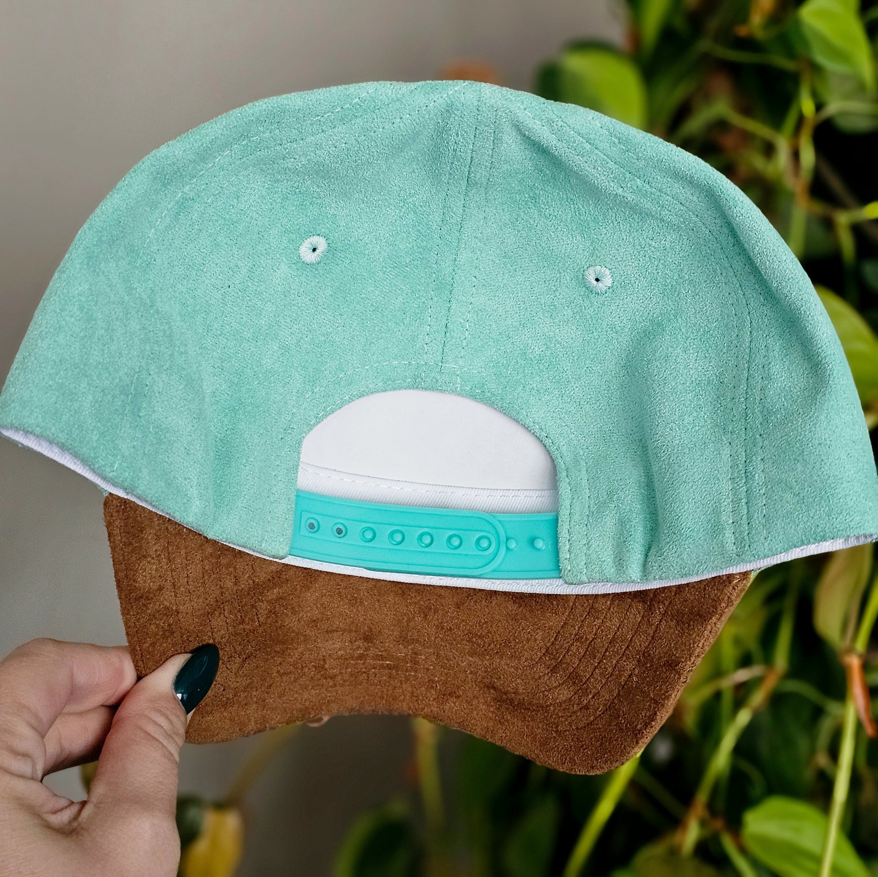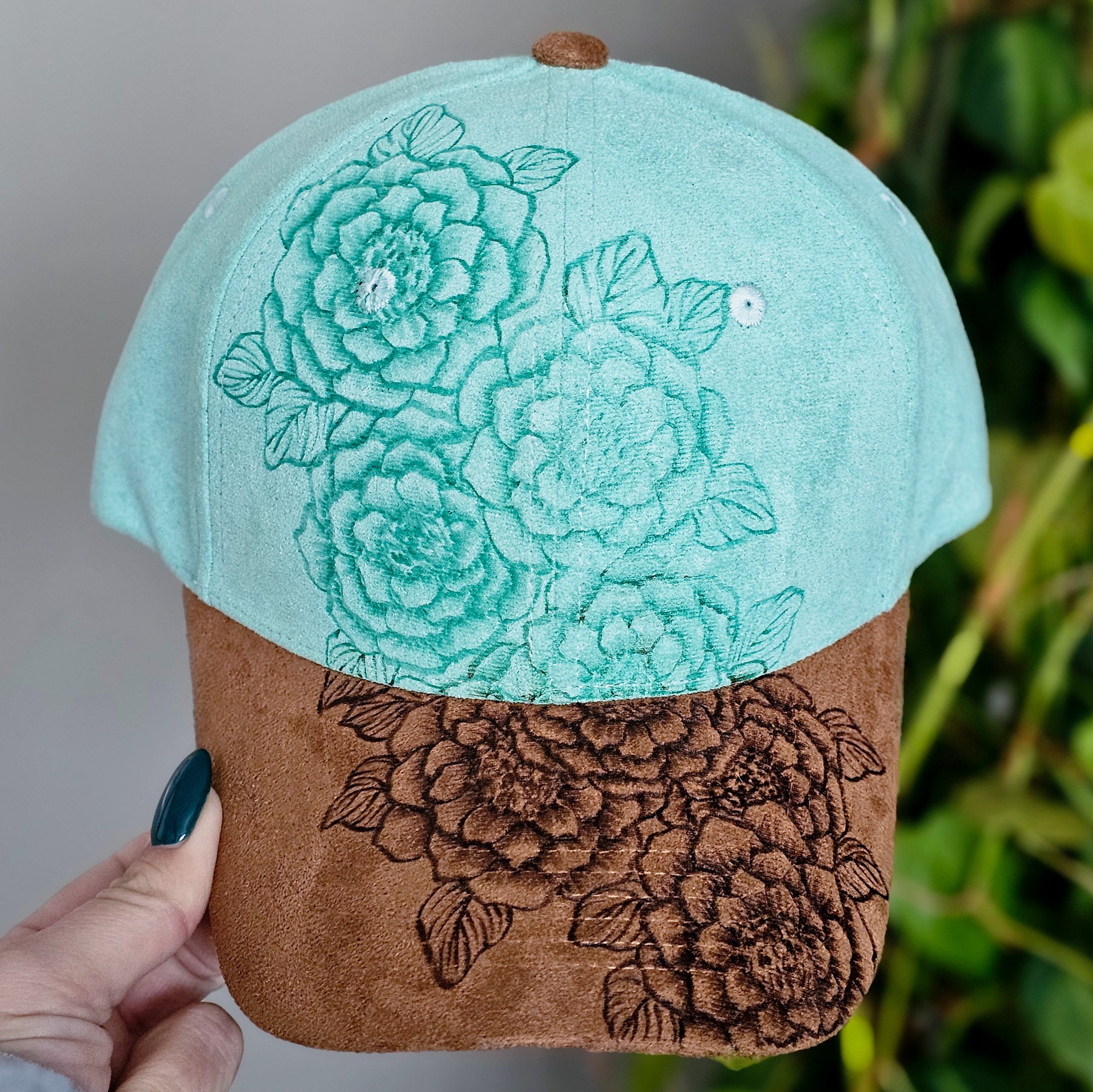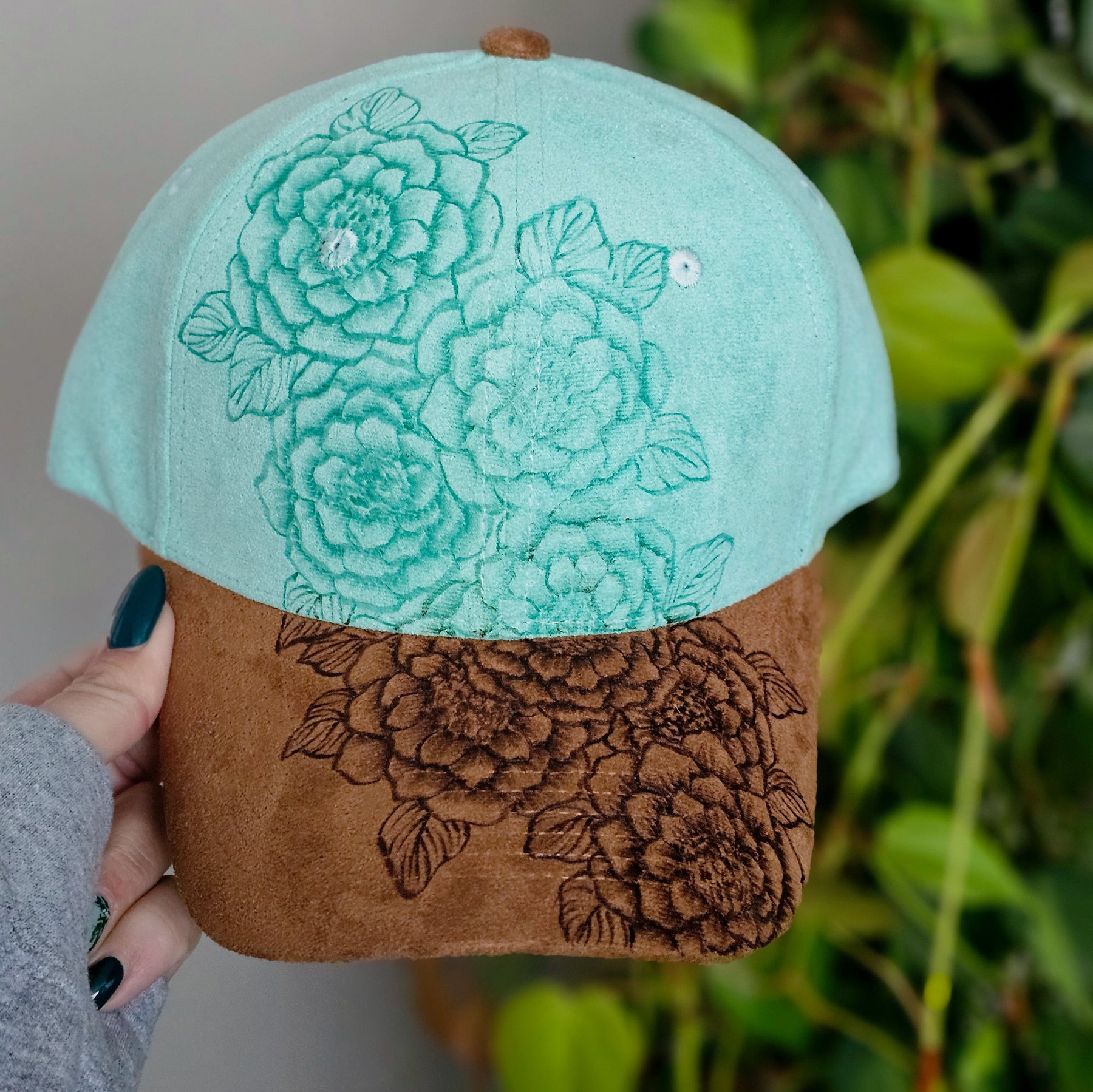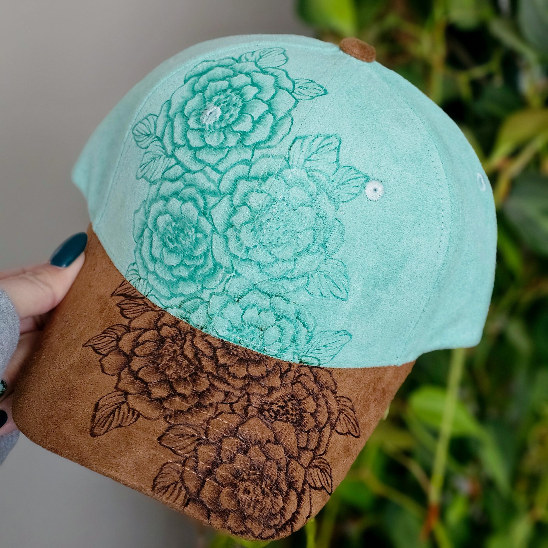 Rosettes || Aqua and Tan Suede Baseball Style Hat || Freehand Burned