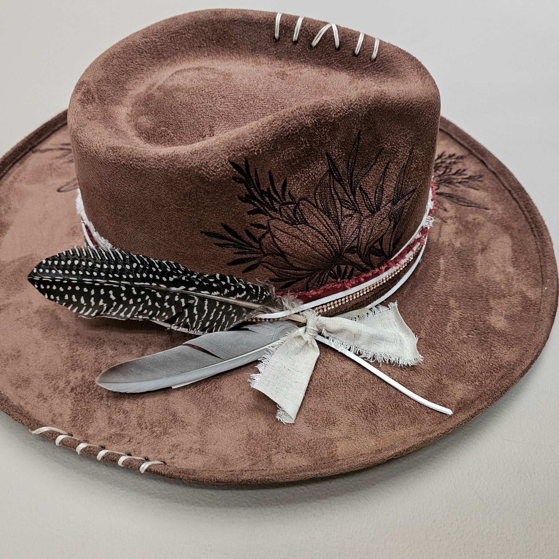 All hats are freehand drawn and burned with a heat tool. Most of my designs include floral and stems. I've always been drawn to flowers since I was a child. My grandma has the most beautiful garden and she was always rattling off the names of each one and showing me their gorgeous blooms.
