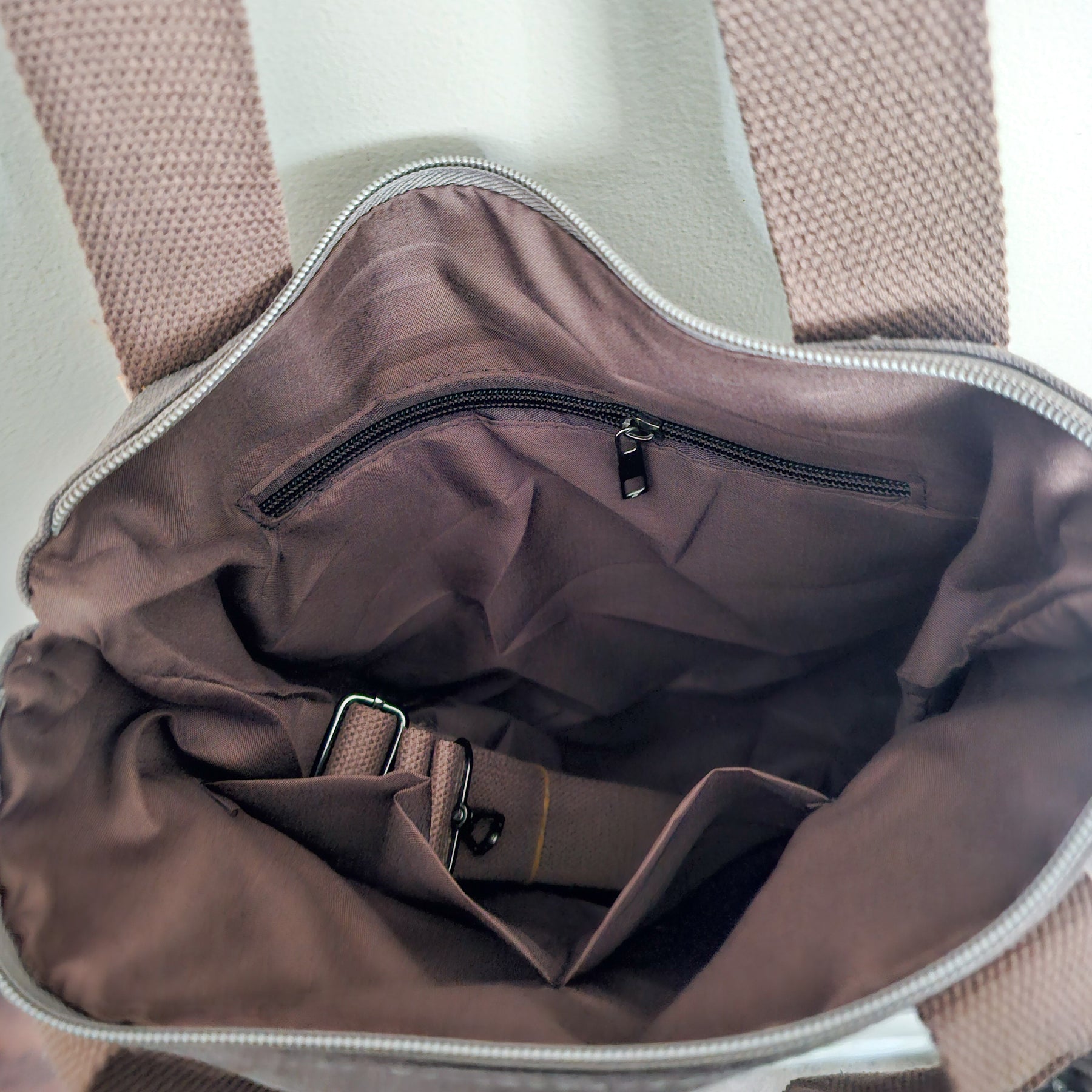 Inner lining with a zipper pocket and two open pockets.
