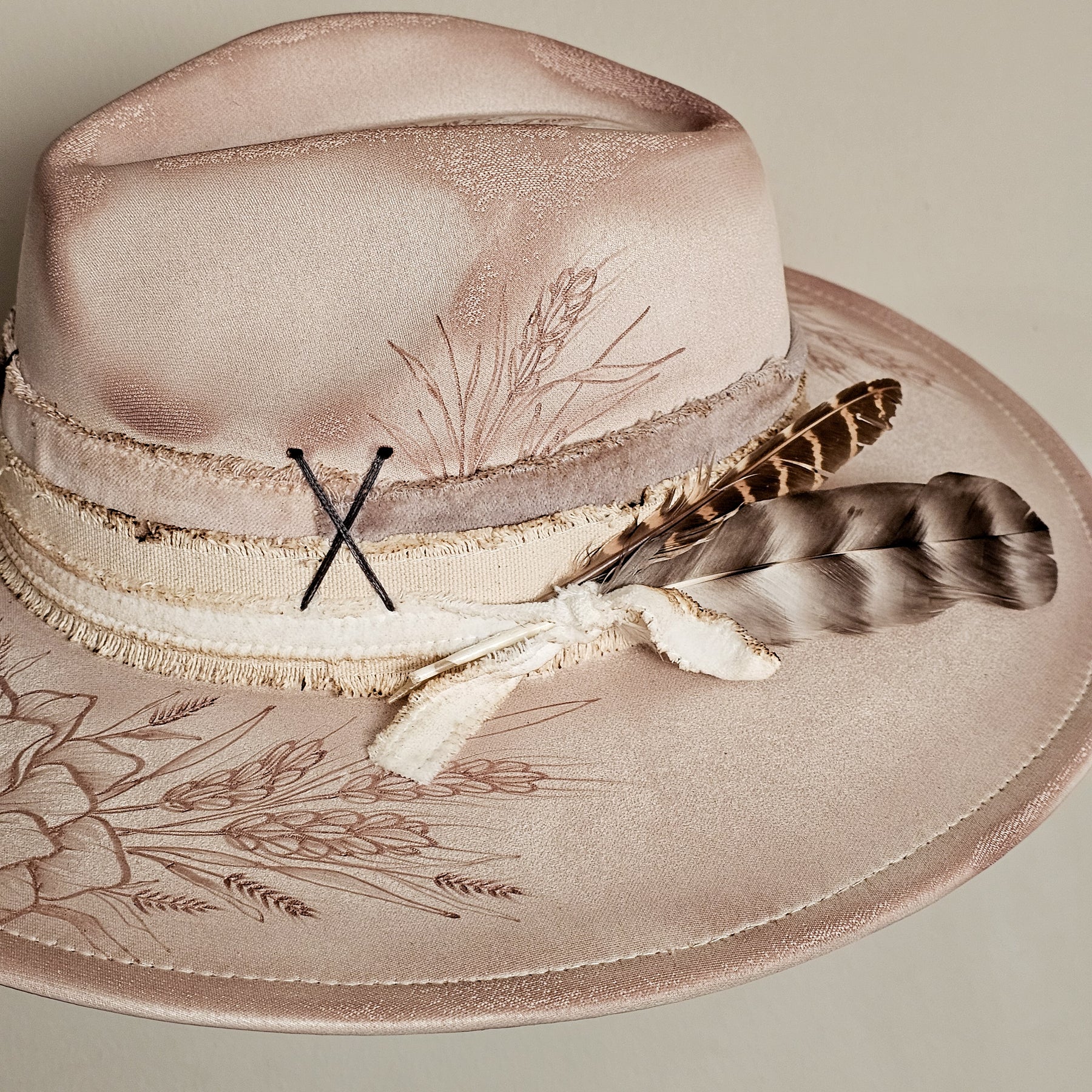 All hats are freehand drawn and burned with a heat tool. Most of my designs include floral and stems. I've always been drawn to flowers since I was a child. My grandma has the most beautiful garden and she was always rattling off the names of each one and showing me their gorgeous blooms.